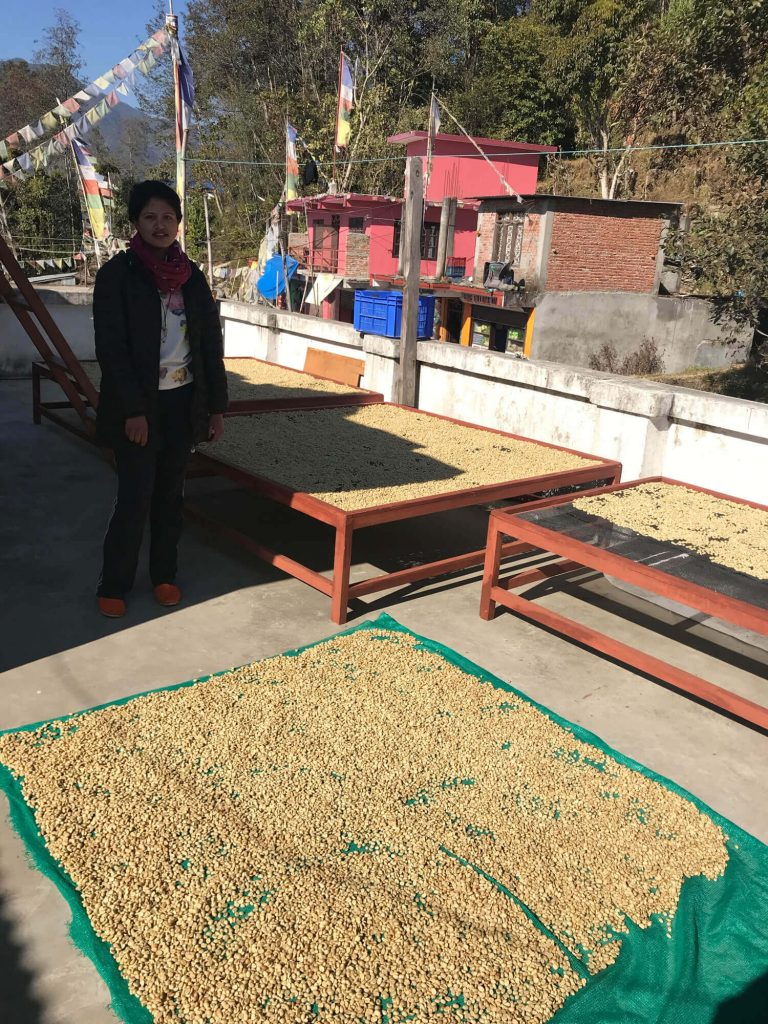 Putting their heads together as how best to help, Maya Devi came up with the concept of high value, organic, mountain Arabica coffee, just a few trees per family. She requested Ambica for training on how to cultivate and process the coffee fruit, a tree that requires little water, offers annual yields without replanting, and grows on unused edges of terraces and fields. Only by combined effort and some outside assistance would it make economic sense for these semi-literate ladies to take such a risky step towards a brighter future.