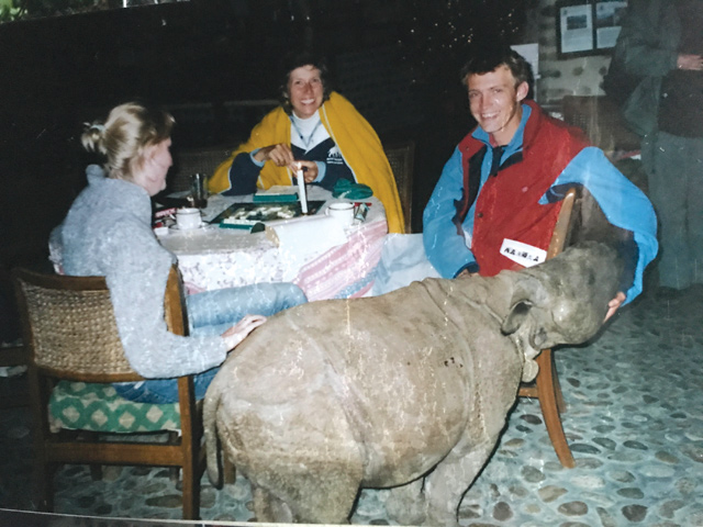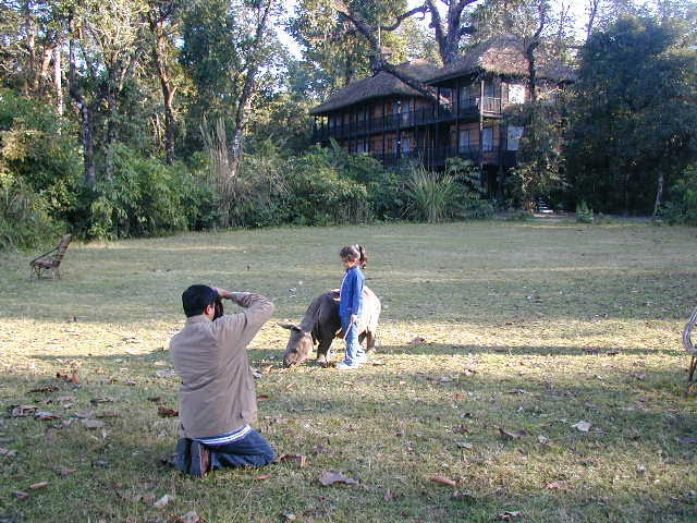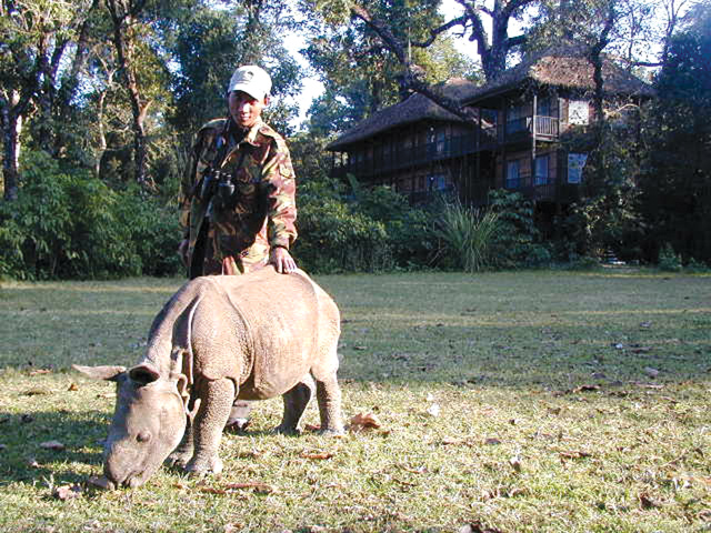Late on New Year’s Eve 2003, enjoying a few drinks with Anton Mosimann, the dapper Swiss celebrity chef, a fully-grown adult rhinoceros startled us by wandering purposefully into the elephant camp, then settling peacefully, stretched out by the open fire like some bizarre giant dog. Reared in captivity in Sauraha, this individual felt safer at night amongst humans, and was returning home after an unsuccessful attempt at rehabilitation in a distant corner of the Park. It seems irreverent in retrospect, but the rhino allowed us to clamber onto his armour-plated back for surreal selfies.